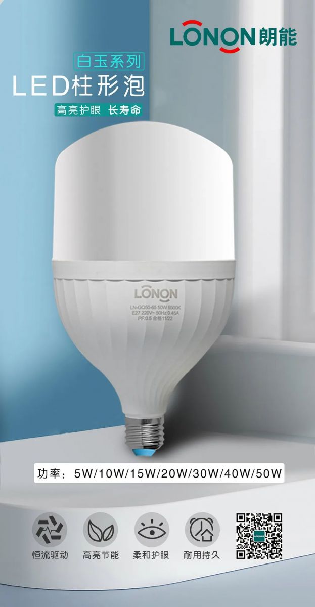 朗能LED柱形燈泡,產(chǎn)品規(guī)格齊全、多種功率選擇。 5W\10W\15W\20W\30W\40W\50W, 獨(dú)立安裝或配套吊燈、臺(tái)燈安裝使用,選擇多樣,應(yīng)用靈活,安裝便捷,家家戶戶都用得上!