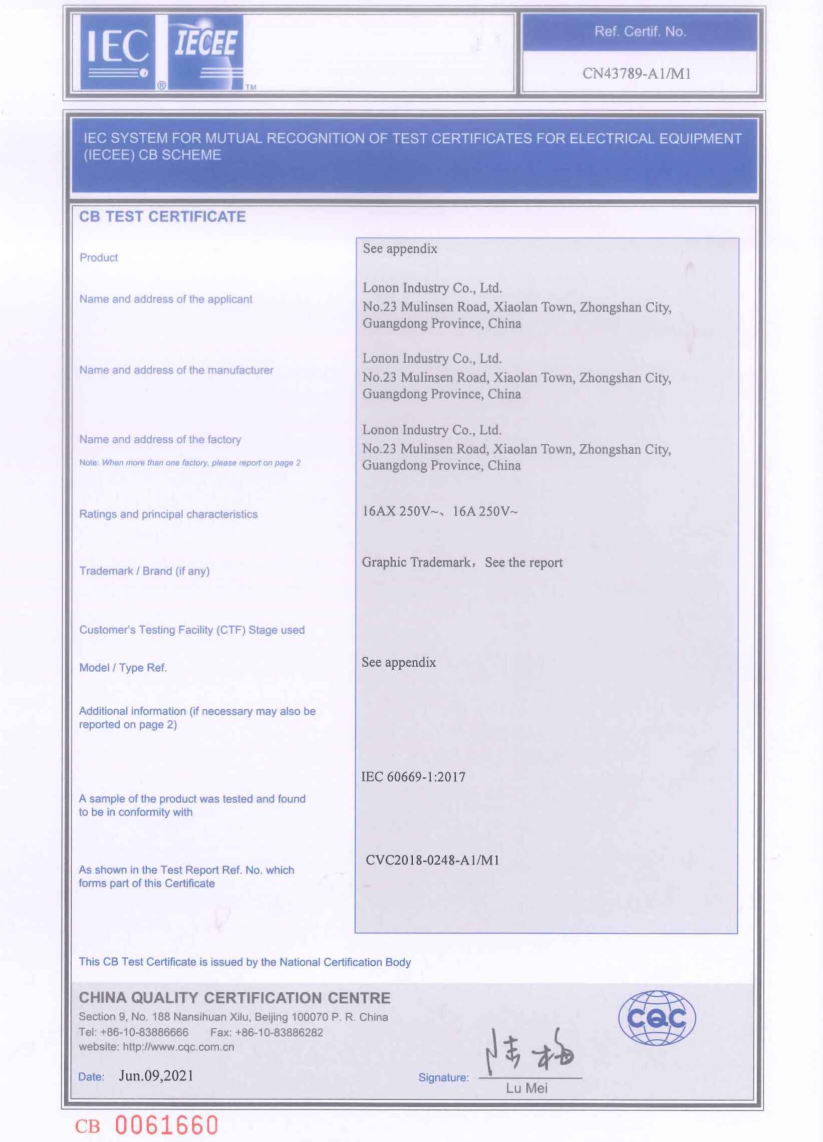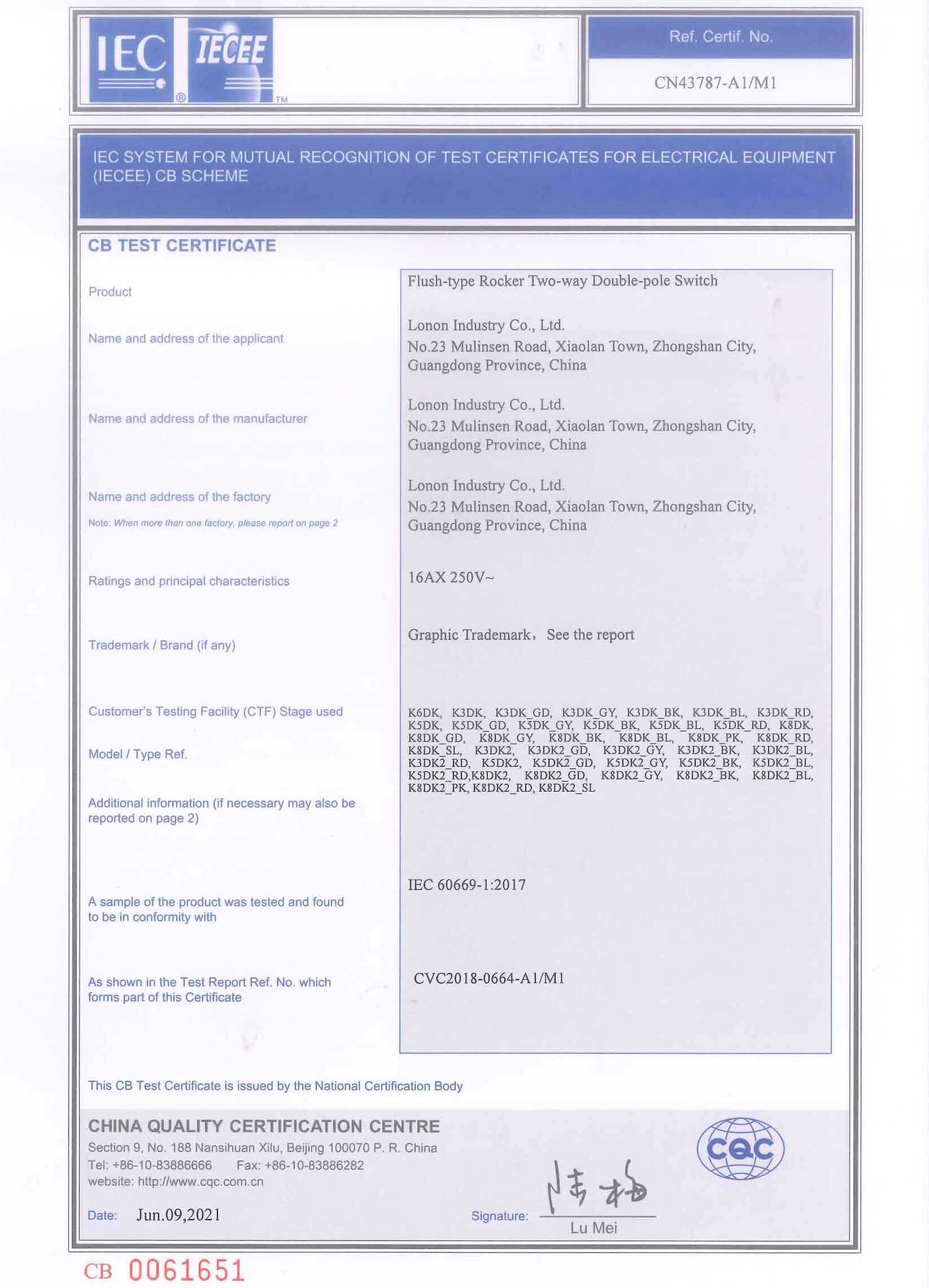 CN43789-A1/M1 K3K5K6K8_16A CB Test CERTIFICATE